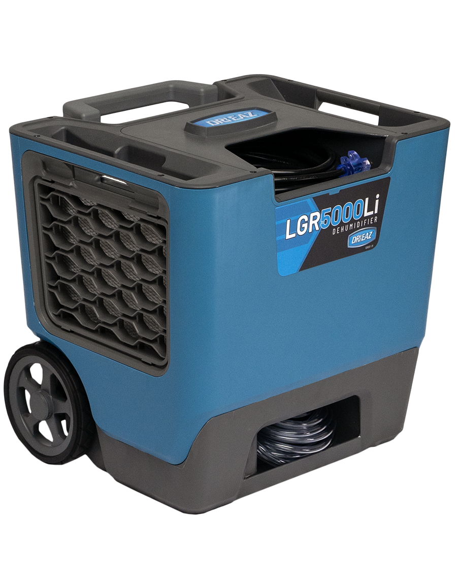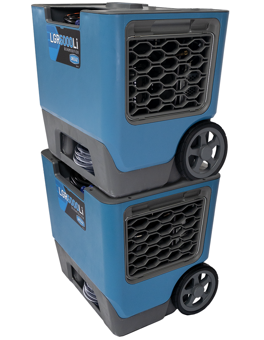 Stack two of the new compact Dri-Eaz LGR 5000 commercial dehumidifiers to roll onto your next water damage restoration job to streamline the load in. With max water removal of 164 pints, the ultra-compact LGR 5000Li portable dehumidifier is the perfect size for most water damage restoration jobs. It's also amazingly quiet, lightweight and draws only 5 amps.