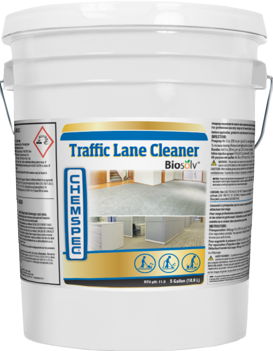 Chemspec's Traffic Lane Cleaner with Biosolv is a prespray concentrate for hard-to-clean carpet areas. Removes the heaviest soils while saving time and effort. Highly effective all-purpose spotter. Boosted with our Biosolv citrus additive for extra grease-cutting power.